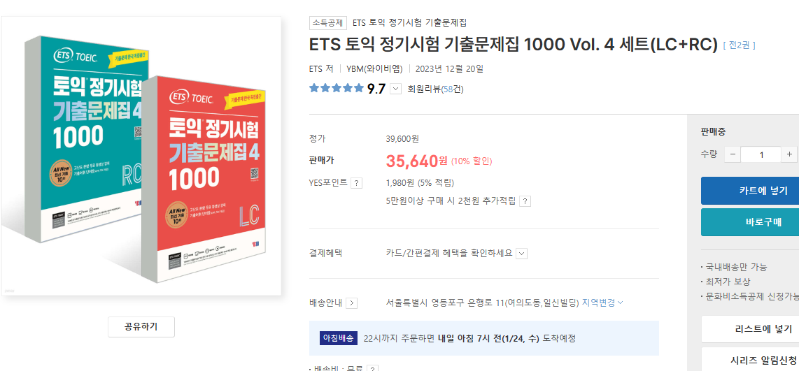 1. 지금 (24/1/23)은 토익시험 주관사가 출제한 ets 문제집 아래 ets 1000제 4가 가장 최신이예요 !!